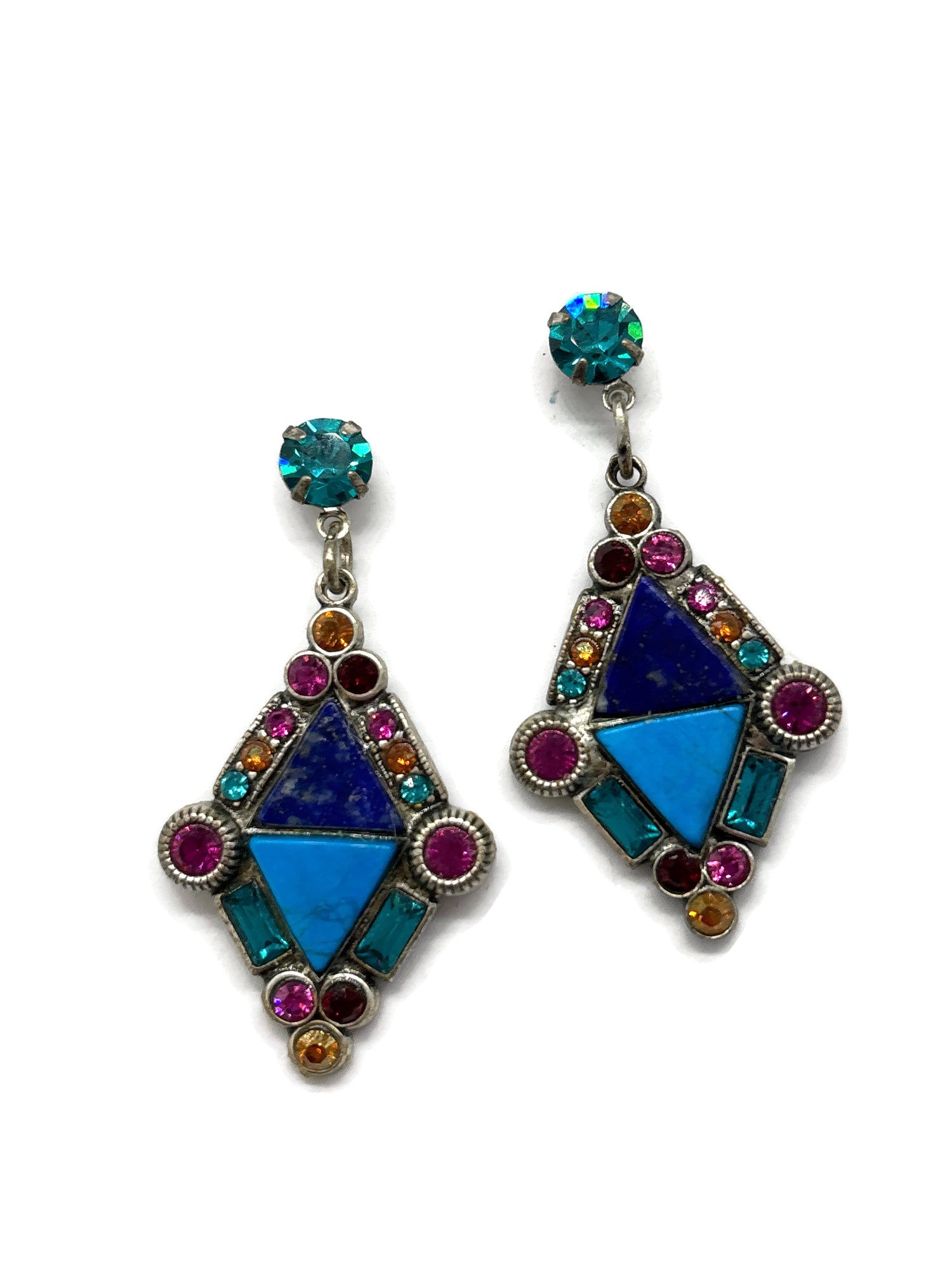 Art Deco multi colored triangle cabochons set in antique silver on a post.  Approximately measuring 2” L/1” W. Final Sale.
