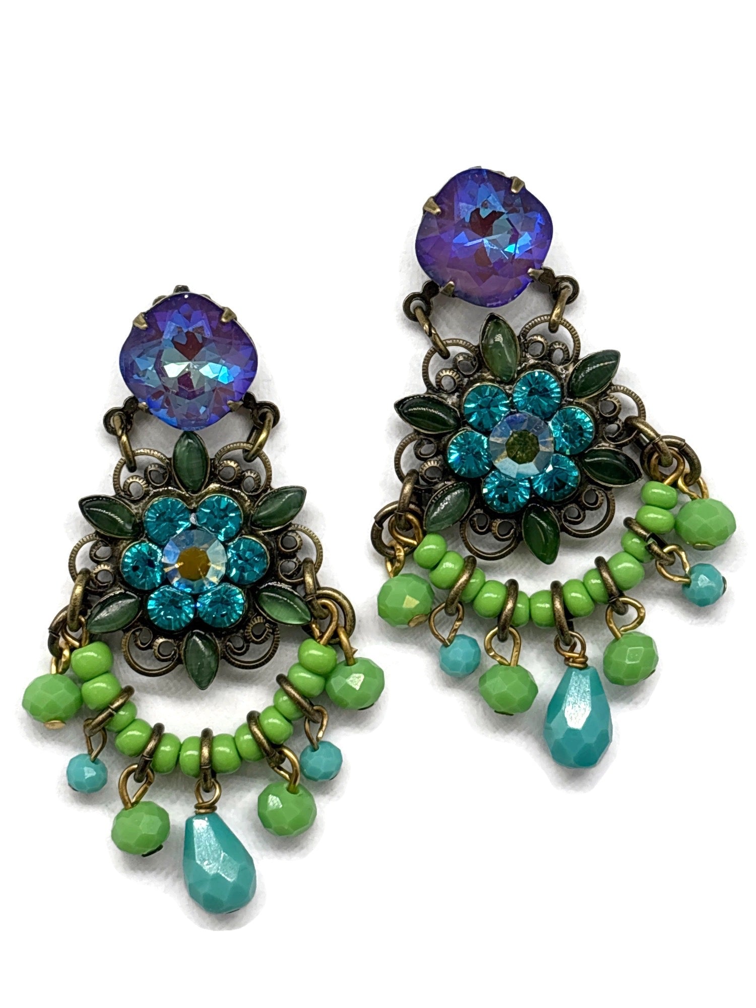 Statement Boho earrings set in antique gold in peacock colors. Approximately measuring 2”L/1” W. Final Sale.