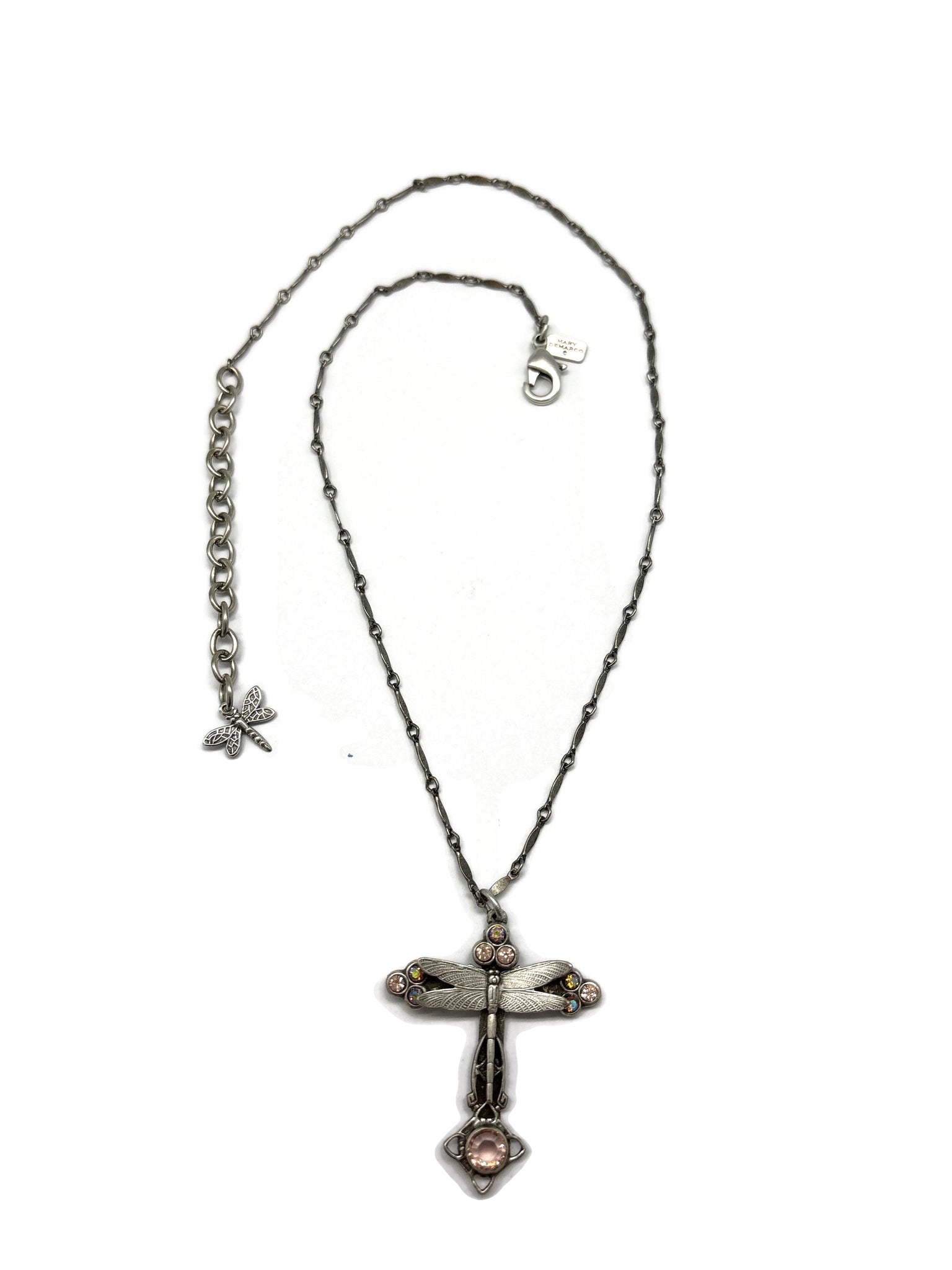 Dragonfly cross in antique silver with mixed peach and AB topaz crystals. Chain is 18”L plus extension. Cross is 1&3/4”L/1”W. Final Sale.